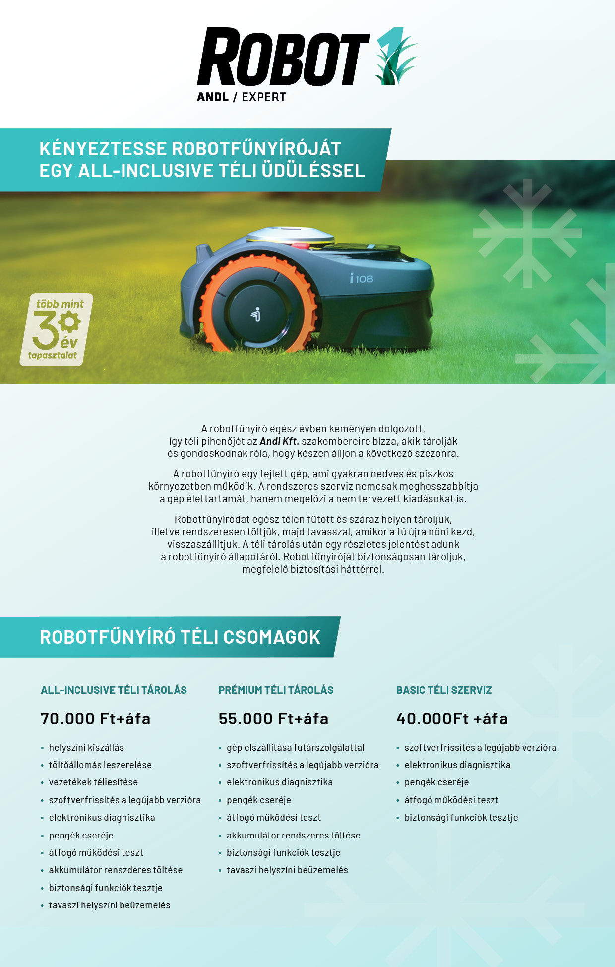 Szezon végén minden robotfűnyírónak jár egy alapos szervizelés, hogy a következő szezonban is kirobbanó formában legyenek! Mi ehhez biztosítunk 3 csomagajánlatot!