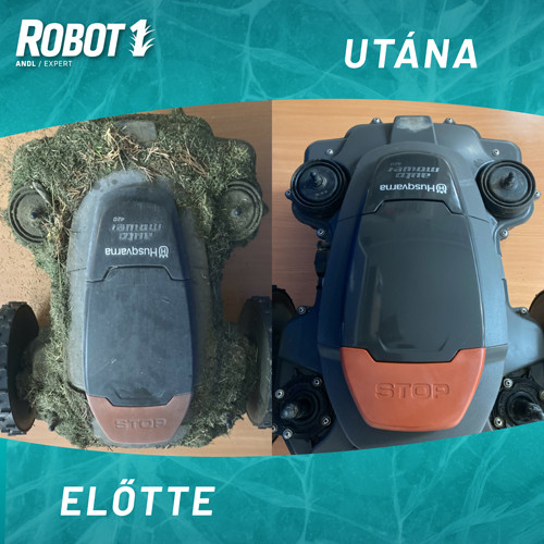 Az alábbi fotókon egy robotfűnyíró tisztítás előtti/utáni állapotát tekintheti meg!